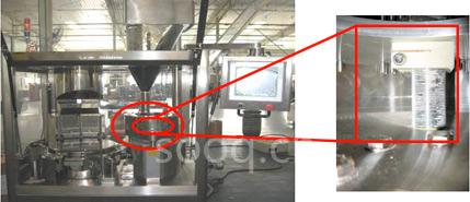 由于全自动胶囊填充机每小时填充胶囊的数量庞大,因而药粉的填充是一个比较重要的过程,直接关系到每粒胶囊内药物成分的含量是否达标。在该设备上,盛粉环(上图中画红圈的部分)内部药粉的高度是由电容式传感器控制的(见上图右)。在药粉罐装过程中,一旦到达规定的盛装高度,则电容式传感器会被激励,对主控PLC输出一个高电平的开关量信号,从而停止灌装设备,以防止药粉从料斗内溢出,造成材料的浪费。