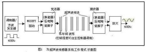 可选用国产TC40-167R系列或MA40S2S(发送传感器)、MA40S2R(接收传感器)超声波传感器.其主要参数为(以TC40-167R为例):标准频率40±0.1KHz;灵敏度(dB)≥-68;声压(dB)≥114;方向角(度)60;静电容量/pf-2500;工作温度(℃)-20℃--+70℃;有效距离≥15M,反射接收有效距离为4M-7M.