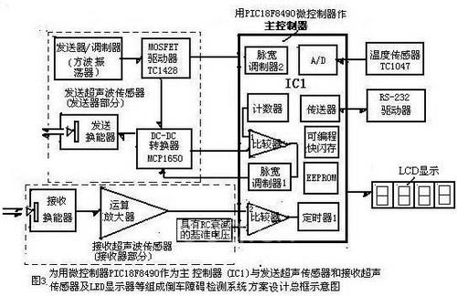 设计方案包括:IC1主控器-为用Microchip的 PIC l8F8490微控制器作为汽车倒车障碍检测系统的主控器;发送部份(即发送超声波传感器)与接收部份(即接收超声波传感器);温度传感器(TC1047A)、通信接口RS-232驱动器以及与LCD或LED显示器等外围电路组成。 用微控制器作为检测系统的主控器