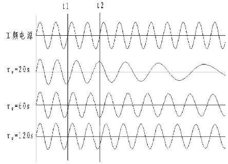 由图11可以看出随着时间的推移,感应电动势的相位与工频电源的相位逐渐拉开,τp越小拉开越快,τp=20s的t1时刻仅比初始动作时间推迟了40ms的时间,但与工频相比相位差已经几乎达到了90°,这时的△U就会较大,有可能造成切换的失败。但τp=120s的t1时刻比初始动作时间推迟了80ms的时间,与工频相比相位差只有60°左右,△U就不会超过工频电源电压,可以安全的切换。通过以上分析可知,该切换方法对停机过程较长的系统可以比较容易得实现,而停机过程较短的系统就不太适用了。