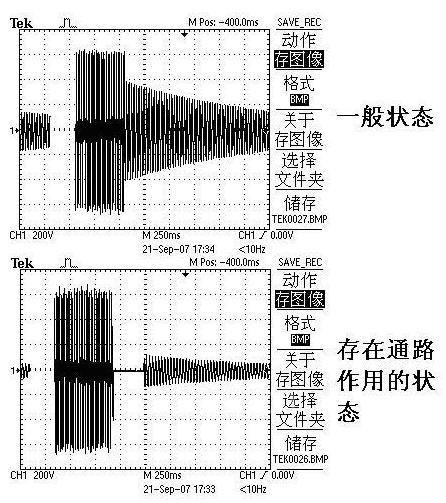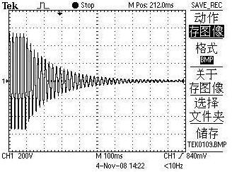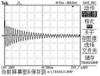 由于变频器输出的是PWM波,其相位不易观察,测得在工频状态下的电压波形进行进一步的分析。因为变频器50Hz时的输出电压与工频电压作用在电机上基本时等效的,并不影响分析结果。图4是一2.2KW电机在工频电源下突然断开电源后的电压波形图,由该图可以看出,电压波形没有跳变,所以断开瞬间感应电动势与电源电压是同相位的,其幅值也是基本相等的。随着剩磁的慢慢消失,电压幅值逐渐降低,同时伴随着转速的降低感应电动势的频率逐渐下降,其相位也逐渐与电源相位拉开。频率越低,单位时间内拉开的相位差也就越大。