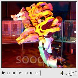 公司最后选择了十台 Robocoaster 机器人,这也是世界范围内第一个允许乘客自己进行编程的乘骑项目。同时,以库卡载重机器人 KR 500 为基础的 Robocoaster 机器人也是第一台允许载客的机器人。乘客可以根据自己的承受能力选择适当的运动模式及速度。他们既可以选择舒适的方式,也可以为了测试自己的胆量而选择一种非常刺激的方式,如选择后者,则乘客将被往上、往下或横向旋转。在此过程中,他们会体验到很强的重力作用。+1.9 g 的压力几乎相当于双倍的体重,而同样会出现的 -1.9 g 负压则会给人失重的感觉。机器人安装在一个最高处为九米的钢铁结构环境的大厅内,还使用了烟雾及 100 个可以发出不同颜色光束的光束炮,以创造出一种不真实的科幻气氛。