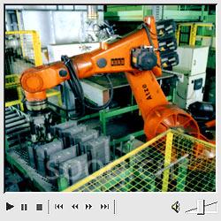 该设备可加工处理约 70 种不同的部件。工作人员将装有部件的托盘置于辊道上,辊道将其输送到 KR 125 处。机器人用磁性夹持器将部件单个夹起,并将其置于另一条穿过高温炉的辊道上的指定位置。烧红的部件从高温炉中出来,随即被固定。然后,两台 KR 200 用其气动收紧夹持器将烧红的部件取下。两台机器人各自将部件置入其所属的淬火机床。