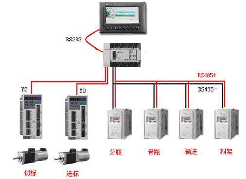 套标机控制的难点在于考验PLC及伺服的响应性,生产效率越高,对于PLC发脉冲的频宽和伺服的动态响应性及频宽要求越高。因此在选用DELTA品牌时,PLC的主机选择性能较高的DVP40EH00T2系列主机,也可选择DVP28SV11T。这两款主机是台达2007年推出的小型PLC中性能最高的。分别有4组200KHz的高速脉冲输出通道及4组200KHz的高速脉冲输入通道,同时基本指令的执行时间明显优于业内同档次的PLC。