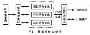 本系统可由信号调理电路、信号采集板和存储发送单元组成。电子柜信号经信号调理电路转换成采集板可以采集的信号后,经信号采集板采集后,再通过CAN总线发送到存储发送单元,然后通过标准RS-485接口发送到诊断单元进行故障诊断。数据采集也可以通过U盘从USB接口中取出,以便用到地面分析处理系统。整个系统的结构框图如图1所示。