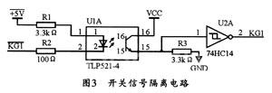 开关信号都是司机给定和电子控制柜发出响应的信号,或系统发出的比较慢的指令信号,这些信号高电平时为5 V,低电平为0 V,本设计使用TLP521-4来进行光电隔离,其开关信号隔离电路如图3所示。当KGI为高电平时,光藕截止。此时可通过3.3 kQ的下拉电阻R3使整形电路74HCl4的输入为低电平;而当KGI为低电平时。光耦导通,整形电路74HCl4的输入变为高电平。R2直接与电子控制柜信号相连接,可起保护作用。该电路的实验测试结果表明,在直接测量整形后的电路时,其Ton=12μs,toff=35μs,可见其可以满足系统开关信号的采集要求。