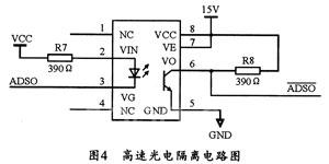 脉冲信号是电子控制柜产生的三段桥晶闸管触发信号,具有高频、高速等特点。其信号隔离需采用高速光电隔离器隔离,本系统选用高速光耦为6N137,其高速光电隔离电路如图4所示。