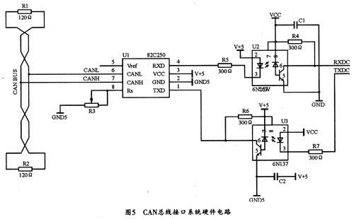 本系统采用的是以Philips公司生产的的P87C591单片机为控制核心的信号采集系统。P87C591是一个单片8位高性能微控制器。该器件具有片内CAN控制器,它采用强大的80C51指令集,并成功的包括了sJAl000型CAN控制器的PeliCAN功能。由于单片机P87C591中内嵌有CAN控制器sJAl000的信号输出口且驱动能力较低,因此,本系统中加入了CAN总线接口驱动芯片P82C250,该器件主要是为高速通讯应用而设计的,它可对总线提供差动发送能力,并对CAN控制器提供差动接收能力。另外,为了增加通信距离,保护总线、降低干扰,提高系统的瞬间抗干扰能力,本设计还在P87C591和P82C250之间加入了由高速光耦6N137构成的隔离电路。其具体的CAN总线接口电路如图5所示。
