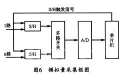 模拟量采集单元的主要功能可以划分为微处理器及其控制部分、CAN通讯接口部分、多路模拟量输入通道选择开关、采样保持芯片、模数转换芯片等。根据单元划分的粗细程度。需采集的模拟量共有30~60路不等。因此,在如此多信号需采集和对信号采集同步性要求较高的情况下,若采用一般采集方法,即由多路开关对信号进行选择,然后经公共的S/H、MD器进行采集。那么,即使S/H、MD器的速度相当高,得出的结论也是不可靠的。所以,信号需采用同步采集。考虑到每路一个MD转换器会增加系统的复杂性和成本,并且系统对信号采集的速度要求并不高,因此,MD转换器还是共用一个为好,但若每路一个S/H,由单片机发出的触发信号同时会触发所有的S/H,保证这可采集的同步性。其信号采集框图如图6所示。