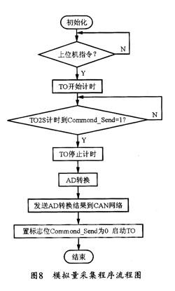 软件设计就是在模拟量采集单元初始化后等待上位机发来的数据采集请求指令,然后启动定时器TO并进行A/D转换,再将转换结果按CAN标准帧格式打包发送给存储发送单元。其程序流程图如图8所示。其中,定时器TO的中断子程序代码如下: