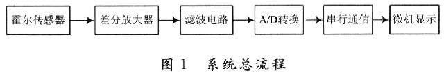 系统可以分为3个部分。第一部分是信号源,由霍尔传感器产生电压信号,信号通过差分放大,滤波得到较清晰的信号;第二部分是信号经过A/D转换送入单片机进行处理,再通过串行通信送入PC机处理得到结果;第三部分是数据的显示,这部分是通过VB的绘图程序来完成,显示结果以v-x关系图来显示。系统总流程如图1所示。