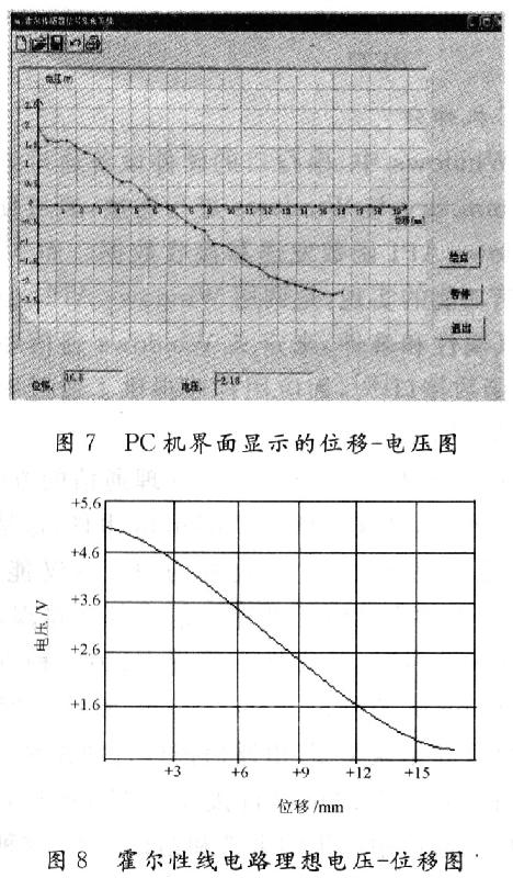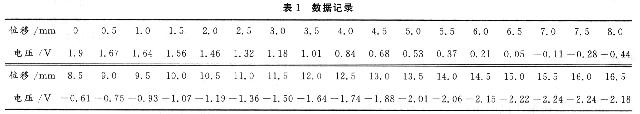 从图7中PC机界面显示位移一电压坐标图,表1记录的数据以及图8在示波器上显示的霍尔线性电路理想电压一位移曲线图相比较,可以发现由于传感器实验台受外界干扰等原因使得输出信号输出误差在所难免,而且没有电平转换,使得VB绘图中得到的数值存在负值;但是可以在图中看到传感器输出的电压值在正负之间有明显的对称性,与要求输出的理想输出信号波形相符合,证明本系统运行良好,设计的非常成功。