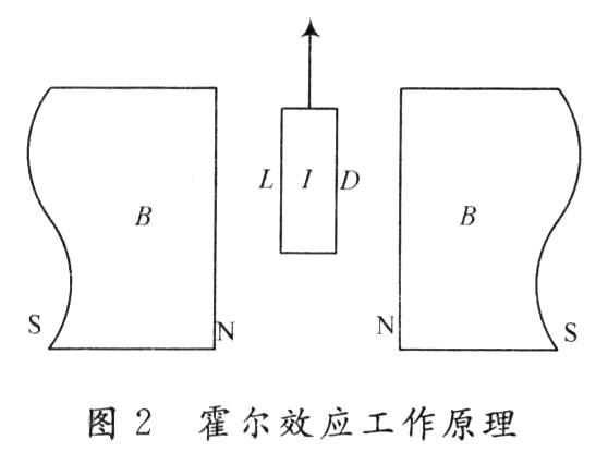 霍尔传感器是利用霍尔效应实现磁电转换的一种传感器。它具有灵敏度高,应用广泛的特点。其工作原理如图2所示:一块半导体薄片,其长度为L,宽度为B,厚度为D,置于磁感应强度为B的磁场中,在相对的两边通以控制电流I,且磁场方向与电流方向正交,则在半导体的两边将产生一个与控制电流和磁感应强度乘积成正比的电势U,该电势即为霍尔电压,用UH表示,即UH=KHIB,其中KH为霍尔元件的灵敏度,半导体薄片就是霍尔元件。