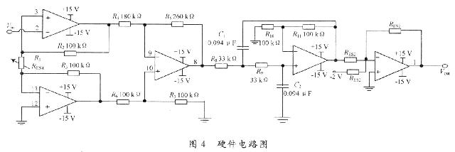放大处理后的电压信号,虽然在幅值上达到了可以处理的范围,但模/数电压转换的范围是0~5 V,而传感器输出的电压存在负值,为了使电压匹配,信号电压在接人模/数转换器前可以加一级加法电路,将电压信号全部转换为正值。放大电路、滤波电路和加法电路均使用LM324实现,硬件电路如图4所示。