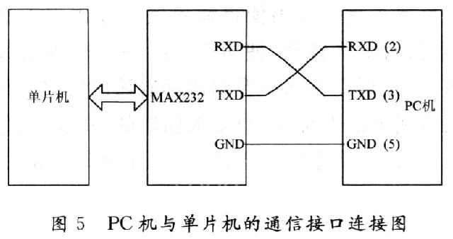 该设计中采用异步串行通信的方式。而AT89C51 单片机的串行口,当工作于方式1,2和3时,UART(通用异步接收和发送)可以实现单片机系统与PC机之间的串行通信。PC机串行通信主要是通过串行口芯片8251实现的。8251有10个寄存器,端口地址从3F8H~3FEH(c0M1),可以通过对8251编程来指定通信协议即通信的波特率、数据位数、奇偶类型和停止位长度。另外由于Pc机串口的电平是RS 232电平,不与单片机串口的TTL电平兼容,因此需要在它们之间进行电平转换。传统的方法是使用MCl488将TTL电平转换成RS 232电平,用MCl488实现反向转换,由于MCl488需要±12 V电压,使用中非常不便,故该设计采用MAXIM公司的产品片MAX232来实现,由单+5 V的电压供电,既可实现TTL到RS 232的电平转换,也可实现RS 232到TTL电平的转换,使用十分方便,具体的线路如图5所示。