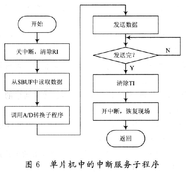 由于单片机多应用于实时性较强的控制场合,为了尽量少占用CPU的时间,充分发挥CPU的功能。该系统在单片机程序设计中采用中断方式与PC机进行通信。主程序只进行串行通信、数码管实时显示、模/数转换结果的初始化和循环等待串行中断工作,当接收到PC机发来的信号时,就转人中断服务程序,进行A/D转换,并向Pc机发送数据。中断服务子程序流程图如图6所示。