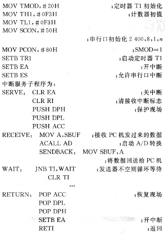 AT89C51系列单片机的串行口可工作于4种不同的方式。在该程序中,单片机串行口工作设定为方式1,即数据经TxD端发送,RxD端接收,波特率2 400 b/s,10位构成一帧,l位起始位,8位数据位,1位停止位,初值0F3H,SMOD=1。