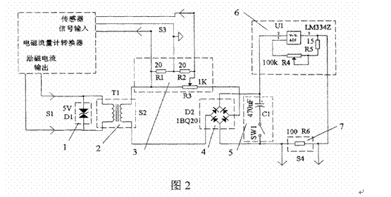 1)将电磁流量计励磁电流S1 的两个输出端分别与双向稳压电路两端及变压器的初级线圈的两个输入端并联,变压器次级线圈输出与S1电气隔离的信号同步源和工作电源S2 。