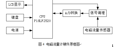 利用PIC18LF2520等芯片就可以对电阻R6两端的电压信号和S3上的方波信号进行测量。从而可以获得调节电压值和流速信号值。其电路框图如图4所示。电路的硬件设计主要包括信号调理,A/D转换,LCD显示及单片机相关的外围电路等部分。电磁流量传感器得到的电压信号经过信号调理电路处理后,由A/D转换器进行模数转换,再由CPU进行数值处理,采用液晶显示器显示相应的流速。各个模块的只要功能如下:
