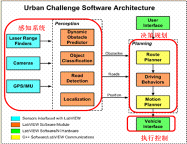 来自弗吉尼亚理工大学的团队需要在12个月开发出全自主地面车,他们将开发任务分成四个主要部分:基础平台、感知系统、决策规划和通讯架构,如图4所示。每一部分都基于NI的软硬件平台进行开发:通过NI硬件与现有车载系统进行交互,并提供操作接口;使用LabVIEW图形化编程环境来开发系统软件,包括通讯架构、传感器处理和目标识别算法、激光测距仪和基于视觉的道路检测、驾驶行为控制、以及底层的车辆接口。