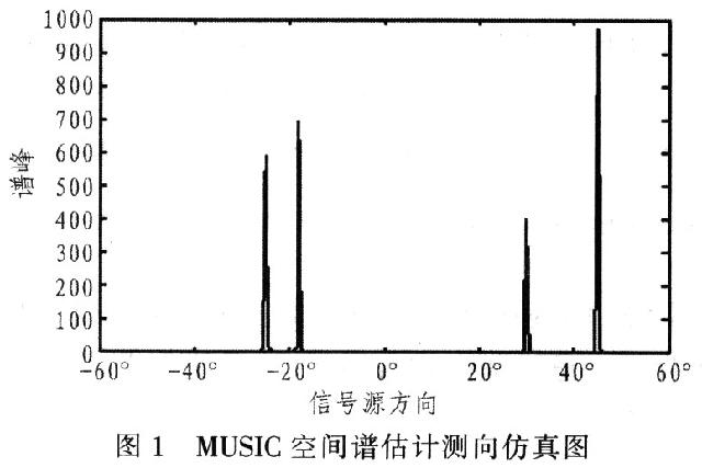 空间谱估计测向是一种以天线阵输出信号的空间相关特性为基础的超分辨谱估计方法。MUSIC算法是基于特征结构分析的空间谱估计方法,其测向原理引是根据矩阵特征分解理论,对阵列输出协方差矩阵进行特征分解,将信号空间分解为噪声子空间ENH和信号子空间EHS,利用噪声子空间ENH与阵列的方向矩阵的列矢量正交的性质,构造空间谱函数P(θ)并进行谱峰搜索,从而估计出波达方向信息。图1给出采用MUSIC算法进行空间谱估计技术仿真测得的信号源方向消息,其信号源方向分别为45°,30°,一18°,25°。根据图1 MUSIC算法仿真结果可以看出,该算法可精确确定信号源方向信息。