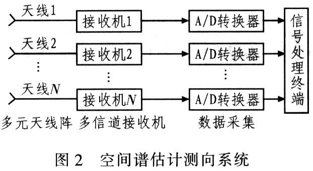 随着电子技术的发展,电子对抗在武器系统中扮演着重要角色,电子对抗体系向多样化发展,诸如利用电子干扰设备直接干扰对方电子系统正常工作的电子对抗方法;利用武器弹药系统攻击对方电子设备。无论采用哪种方法赢得战场主动,其前提条件是要知道对方通讯设备、无线电通信以及其他发射无线电信号的电子设备的方位。此外,为了实施对多源(如多发引信、多台通信机或干扰机)的干扰,需有效利用我方干扰机的功率资源,确定发射源的方位,可采用转动接收天线的角度确定发射源方位。但这种方法存在测角精度和测量速度的矛盾,难以满足空间存在多个运动目标时,确定各目标方位的要求。而空间谱估计测向技术可实现对空域中多个目标的同时超分辨测向,因此,这里给出空间谱估计测向系统设计方案。