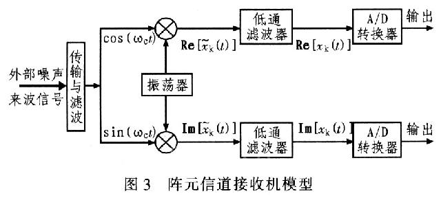 每一天线阵元的输出送至各自的接收机输入端。如N个天线阵元,就有N个完全相同的接收机。接收机将信号放大、变频到适合A/D转换的频率,从而输出中频信号。也可将A/D转换器和接收机集成一体,直接输出数字信号。为了完整保存各天线阵元接收的信号幅度和相位信息,一般采用I、Q通道方法,即在中放末级采用正交混频,将相位相差90°两路本振信号送到两个混频器,其输出的低通信号即为I和Q通道信号。I和Q通道各接一A/D转换器,其输出就是数字化的复信号的实部和虚部。各个阵元的接收机模型如图3所示。