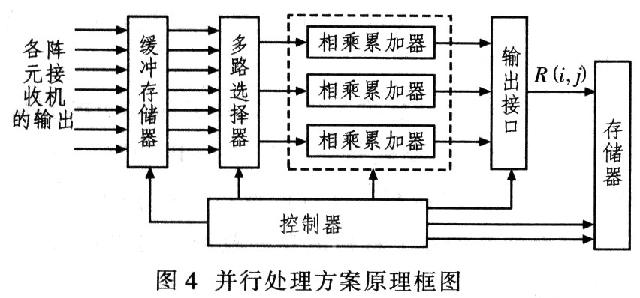并行方案与串行方案的区别在于:并行方案使用多个并行相乘累加器进行计算。这样可有效提高整个系统的处理速度。并行处理的方案应当做到使各处理器的负载平衡,对于含8个阵元的测向系统,需要求出36个元素的值,因此可选用2,3,4,6,12,18,36个相乘累加器的不同的并行处理方案。显然相乘累加器越多,处理速度越快,但其成本也高。