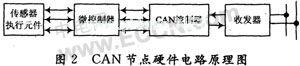 图2为硬件电路设计的原理框图。其中主控制器选用ATMEL公司的ATmega128单片机,总线收发器为TJA1050。其中ATmega128为ATMEL公司生产的基于RISC结构的高性能低功耗的新一代8位单片机,其主要功能如下: