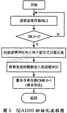 微控制器和SJA1000之间状态、控制和命令信号的交换都是在控制段中完成的。初始化加载后,寄存器的接收代码、接收屏蔽、总线定时寄存器0和1以及输出控制就不能改变了。SJA1000共有2种工作模式:复位模式和工作模式。当硬件复位或控制器掉电时会自动进入复位模式,只有在复位模式下才可以对SJA1000进行初始化。初始化主要包括工作方式的设定、接收屏蔽寄存器和接收代码寄存器的设定、总线时序寄存器的设置、输出模式寄存器和中断使能寄存器的设置等。在初始化完成以后,CAN总线就可以开始进行数据的接收与发送工作,其初始化流程图见图3。