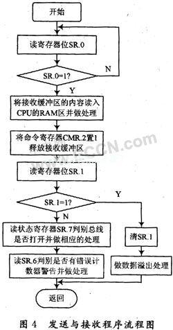 首先与CAN控制器连接的微处理器必须将要发送的数据从其数据存储区中取出,与主机的ID地址一起组成信息帧按CAN报文结构发送到发送缓冲器中,并置位命令寄存器中的发送请求标志,接收到发送请求后发送过程由CAN控制器自动完成。在检测到接收缓冲器中存在有效报文后,接收程序将接收缓冲器中的内容读入CPU的数据存储区。接收完毕后检查总线状态及溢出情况等并做相应处理,发送与接收程序流程图见图4。