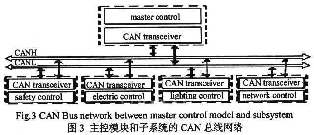 主控模块的处理能力有限,多个子系统和主控模块由现场总线组网构成一个分布式控制系统。各个子系统在主控模块的控制下协同工作。主控模块和子系统之间主要传输信息流和控制流。主控模块到子系统传输的主要是控制流,这些控制流完成子系统的配置或者命令子系统完成特定的任务。子系统到主机传输的主要是数据流,数据流主要包含子系统中各设备的运行状态或传感器数据等。主控模块和子系统的通信可以采用有线方式或无线方式。鉴于有线方式速度快、可靠性高、成本低、技术成熟等优点,本系统采用CAN总线完成主控模块和子系统的联网。系统的联网结构如图3所示。