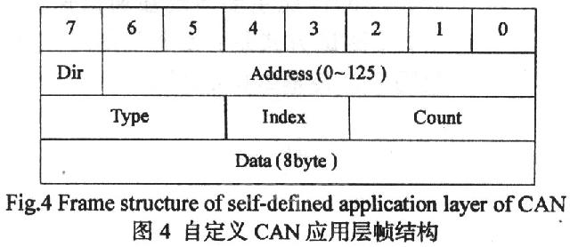 CAN协议是最流行的现场总线协议。为保证协议的灵活性,该协议只定义了数据链路层和物理层,一般CAN控制器会实现这两层协议,针对具体应用需要开发应用层协议。CAN应用层协议标准有DeviceNet和CANOpen。这两种协议是面向大型系统,针对工厂自动化控制和汽车电子开发的,所以智能家居需要使用自定义的CAN应用层协议。智能家居中子系统和主控模块采用点对点的通信方式。自定义应用层协议基于非对称型主从式网络结构。应用层帧结构定义如图4所示。Dir(1 bit):数据传输的方向,0表示主控模块到子系统;1表示子系统到主控模块。