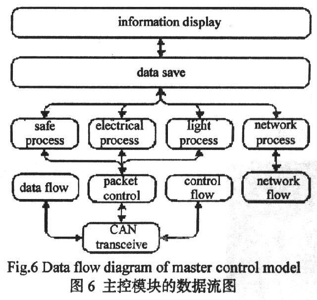 智能控制主控模块硬件上资源丰富,软件上有Linux操作系统的支持,主控模块的软件开发运用了模块化思想,模块的划分依据是高内聚低耦合,将逻辑上紧密耦合的一组功能划分为一个模块。模块划分结果以数据流图呈现出来。主控模块的数据流图如图6所示。安全控制子系统、电器控制子系统和照明控制子系统的数据流和控制流,通过CAN总线网络传输到主控模块,主控模块的CAN通信监控子线程解析CAN网络中传输的数据。接着,主控模块的数据分发处理器子线程根据数据的类型将数据分发到相应的数据处理程序。处理后的数据存储到数据库中,并在界面直观显示分析后的信息。