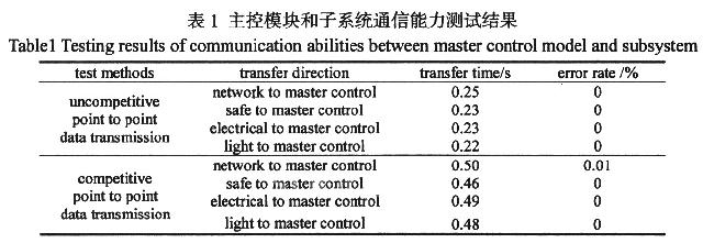 测试主控模块的性能主要体现在通信速度和通信质量。为了获得这些参数,需要测试主控模块和子系统之间的数据传输能力。测试方式是:无竞争点对点双向数据传输测试;有竞争点对点双向数据传输测试。测试指标是:传输时间和误码率。传输200 KB的数据量测试结果如表1所示。
