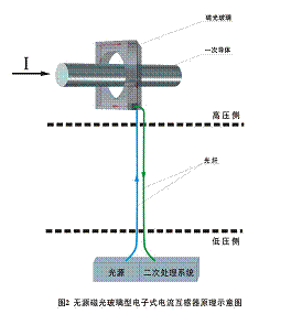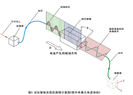 无源磁光玻璃型电子式电流互感器特点是一次传感器为磁光玻璃,无需电源供电。其原理如下图所示: