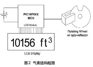 气表和水表是设计起来最简单的仪表。这两种表都采用机械装置来测量气流或水流,它们的输出通常是一个旋转轴(气表中)或者一个旋转磁铁(水表中)。图2给出了气表的结构框图。气表的输出轴上有一个带槽的圆盘和一个能够输出脉冲流的反光器。每个脉冲表示一定量的气流。水表内部通常采用旋转磁铁和霍耳效应传感器,每当磁铁通过的时候,这种传感器就能够产生输出脉冲。气表和水表的脉冲流都可以连接到MCU内部计数器的时钟输入端。气表和水表设计中的一大挑战就是它们附近一般都没有交流电源。这意味着必须用电池或太阳能供电。太阳能电池十分昂贵,会额外增加安装仪表的机械成本。本文的设计方案采用一个低功耗MCU,它能够对脉冲进行计数,周期性地将数据保存到非易失性存储器中,每月上传一次计费信息。图2中给出的实例是采用了Microchip公司的PIC16F9xx系列MCU。这一系列的MCU拥有4~8KB的Flash程序存储器、最多336字节的RAM、256字节的数据EEPROM,内置8MHz的晶振、10位A/D,具有I2C、SPI、USART接口,能够驱动显示168个像素。这些功能再加上低功耗特性(休眠模式下典型电流O.5uA,1MHz下典型电流为190uA)使得这种MCU十分适用于采用电池供电的气表和水表。