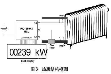 不同用户所居住的地区和国家的供热方式可能不同。采用热水流过暖气片进行供热是比较常见的方式。热表的结构比气表或水表略微复杂一些,因为热力学计算热量的方式涉及温度和流量。热表要同时测量暖气片入口和出口的温度,还要测量水流通过暖气片的流速。根据这些测量结果,MCU再根据热力学公式计算出热能使用量。图3给出了一个热表的实例。为了降低热表的成本,我们可以采用MCU来校准和调节温度传感器。温度传感器通常采用RTD(电阻式温度检测器)或类似的器件,它们能够浸泡在液体中工作。MCU中可以保存一个校准表,用于把传感器的模拟输出量转换为线性的温度值。热表中使用的流速表与水表中的类似,也会产生输出脉冲。热表的设计还有另外一个挑战是气表和水表没有的。热表都是安装在用户住宅内的,不像气表和水表可以安装在户外。没有AMR功能,抄表员记录热能使用量时必须有用户在家里配合。基于MCU的热表很容易实现RF功能,即使用户不在家也可以进行抄表。图3中的实例也采用了PIC16F9XX系列MCU,它具有低功耗特性并集成了LCD模块。