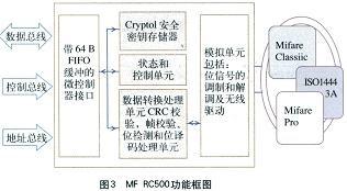 MFRC500是PHILIPS公司为RFID卡设计的专用读卡芯片,它与射频卡之间通信标准兼容ISO14443A,其功能框图如图3所示。