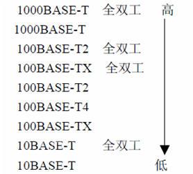 其中最低的级别是10BASE-T(半双工、共享以太网),最高为1000BASE-T全双工。这是一个完整的优先级别方案,但不表示某块网卡可以处理所有这些技术。实际上,有一些技术在商业上并没有实施,但它们都与IEEE802.3标准一致。每个端口检查各自的技术性能并确定最终的速率(较低的速率)。例如:如果网卡支持10BASE-T而交换机端口能力在10BASE-T或10BASE-TX,那么最终选择的是10BASE-T。如果一块网卡是10BASE-T,而另一块100BASE-TX,两者因为不兼容而无法通讯。