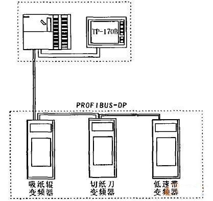 该切纸机的控制系统主要由西门子公司S7-300控制器,西门子公司的变频器、运动变频器,以及西门子公司的TP-170B触摸屏Profibus-DP网络组成。示意图如下: