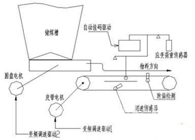 每个储煤槽中的单种煤通过圆盘给料机均匀地落到定量给料机皮带上,称量和速度信号分别进入到控制系统,经过乘积运算处理计算出实际给料量,将实际给料量与设定的给料量不断进行比较输出两路PID控制信号,分别对圆盘给料机和定量给料皮带机进行双变频调速控制,使之精确地以恒定的期望给料速率出料,保持每台CFW给料流量的恒定,以确保所设定总配比的要求。自动配煤装置实现24套圆盘给料机、定量给料机的顺序起停、报警以及模拟量的输入、输出,实现系统全自动、半自动及手动的控制,完成不同原煤料混匀给料、煤比计算及配煤流量控制并实现配料系统与带式输送机的起停连锁。圆盘及定量给料皮带机原理如图1所示: