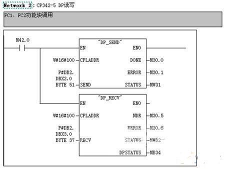 本项目中MASTERDRIVES 与S7 300 DP通信编程步骤依次为:硬件组态(插入从站)、选择数据格式(PP0类型)、I/Q address分配、创建DB数据块、调用功能块FC1(“SEND”)和FC2 (“RECV”)。见下图功能块调用: