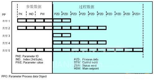 CP342-5 作为Profibus-DP主站时,最多可链接 124个从站,和每个从站最多可以交换244个输入字节(Input)和244个输出字节(Output),与所有从站总共最多交换2160个输入字节和2160个输出字节,但其DP通信编程与S7-300 CPU所集成的DP站有所不同,CP342-5为主站其模块内部的数据寄存器与从站的I/O数据区的通讯过程是自动进行的,但必须填写CP342-5模块的硬件起始地址参数,使CPU能寻址到CP342-5位置,这个起始地址就是16进制的CPLADDR参数,它表示硬件组态的PZD起始地址,可在OB1程序中调用功能块"DP_SEND" FC1和 "DP_RECV" FC2,来完成CPU经CP342-5数据寄存器对PKW、PZD的数据交换;本例中CP342-5模块所连接的DP从站为SIEMENS 6SE70变频器 + CBP2总线适配器,MASTERDRIVES/DC MASTER CBP2 DPV1其PPO(参数过程数据对象)类型共有以下5种: