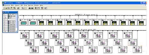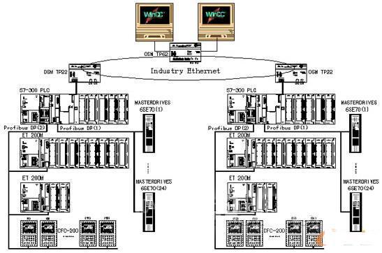 根据本系统的网络通讯要求和特点,在设备层与控制层之间我们选用了Profibus-DP通讯方式,其优点是适合实时性要求高、多个从站设备位置分散、快速周期性数据交换等场合,每套SIMATIC S7-315-2DP CPU所集成的DP口作为分布式I/O ET200M(2套)和CFC-200回路调节控制器(12套)的DP1主站,另一路由扩展CP342-5模块作为DP2主站,连接SIMOVERT MASTERDRIVES矢量变频器 SIEMENS 6SE70+CBP2(24套从站),以上两路Profibus-DP网络确保了配煤系统的综合精度、快速数据交换、同步响应、可靠性、故障诊断和维护等方面的总体性能要求。