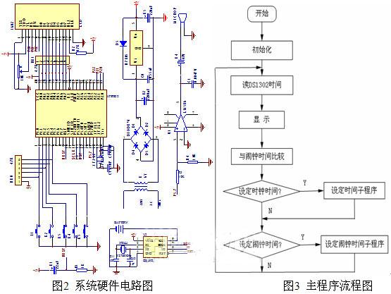 主程序是软件设计的总体框架,因此主程序流程图的设计决定了程序编写的好坏,主程序的功能主要是读DS1302的时间将时间数据送到液晶显示,并与闹钟的设定时间比较,再判断是否有按键按下,从而进行校时、定时功能。其流程图如图3所示。