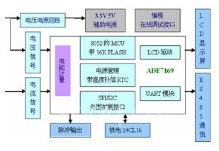 DDSF1352单相复费率电能表采用ADI公司最新技术ADE7169F16片上系统的单芯片设计完成。ADE7169集成了高精度计量单元模块和8052的MCU及其外围模块,计量模块计量精度高、能测量各相电流、电压有效值、各相及总的有功功率、无功功率、电网频率等运行参数,过载倍数大。片上8052的MCU带有16K FLASH和512B RAM和多种外设模块,支持低功耗温度补偿的片上RTC模块、LCD驱动模块、电源管理模块、SPI/I2C接口模块和UART通讯模块等,用一片ADE7169就能实现单相复费率多功能电能表设计。具体设计框图如图2。