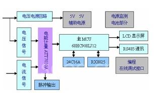 DTSF1352 三相电子复费率电能表采用计量芯片ATT7030A和飞思卡尔公司的8位单片机M68HC908LJ12实现。其原理为:线路上实时电压、电流经高精度互感器耦合,采样电路分别采样后,送到电量计量专用芯片ATT7030A(A/D转换器转化成数字信号,通过片内专用DSP运算后输出电能脉冲),通过脉冲送到MCU中,并根据预先设定的时段完成分时有功、无功电量计量和最大需量计算,分别作出相应处理,并存贮到EEPROM中;同时实现显示和输出、RS485串行数据传输。具体设计框图如图3。