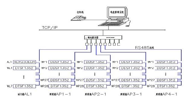 配电系统一次方案图列出了总配电箱及宿舍一层照明箱配电箱的支路数及各支路电能表的型号。为满足智能化监测及远程自动抄表需要,该电能管理系统采用RS485总线,将安装于总配电箱AL1总进线的1台ACR230ELH多功能电力仪表、安装于WL1~WL7及各楼层公共浴室的11台DTSF1352三相导轨式电度表及安装于宿舍楼各楼层的108台DDSF1352单相导轨式电度表(27×4层宿舍楼)进行集中组网,监控中心配置监控计算机、打印机、通讯服务器及必要的辅助设备,安装电能管理系统EMS软件完成对各台电能表的远程采集和数据的集中处理。电 能管理系统图见图5。