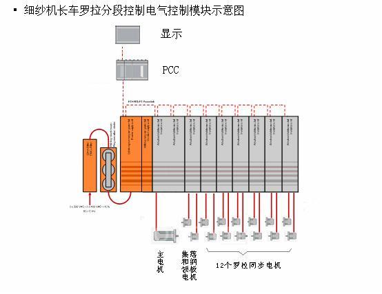 分别由ACOPOS multi伺服控制器控制12个罗拉同步电机传动前中后中间分段的12根罗拉,取消传统意义上的由主轴带动,再通过车头机械齿轮变换来带动罗拉传动的方法。